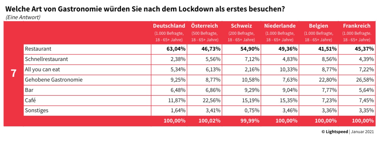 Der fortdauernde Lockdown trifft das deutsche Gastgewerbe ins Mark. Doch wie nehmen Menschen außerhalb der Branche die Situation wahr? Was wünschen sich die Gäste für die Zeit nach dem Lockdown von der Gastronomie? Und wird es sie dann überhaupt noch geben, wie wir sie kannten? Dieser und weiteren Fragen ist der Kassensystem- und E-Commerce-Anbieter Lightspeed nachgegangen und hat im Januar eine internationale Online-Umfrage in Deutschland, Österreich, der Schweiz, den Niederlanden, Belgien und Frankreich durchgeführt. In der Bundesrepublik wurden dazu 1.000 Frauen und Männer im Alter von 18 bis 65+ Jahren befragt.