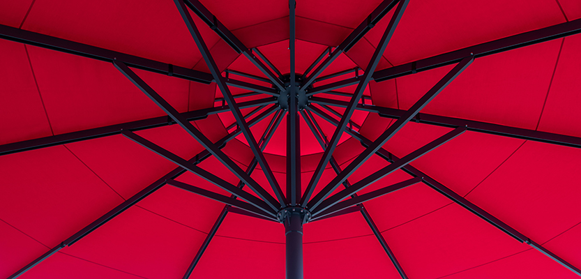 Dank einer Auswahl von mehr als 120 Acryl-Stofftüchern und 200 RAL-Gestellfarben lässt sich der Großschirm auch farblich bestens aufs Ambiente abstimmen.