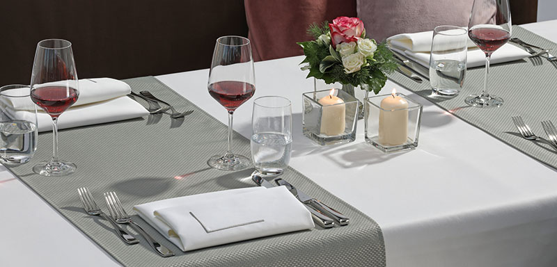 „Damit ist sie gleichermaßen ideal für festliche Anlässe wie für den täglichen Einsatz im Gastraum geeignet", heißt es bei dem Unternehmen aus Laichingen. „Ob mittags zum Lunch oder abends zum Candle-Light-Dinner, als Tischläufer für puristische Einrichtungskonzepte, als Mitteldecke, die Akzente setzt, oder als individuell gefertigte, großformatige Tischwäsche bis zu einer Breite von 270 cm."