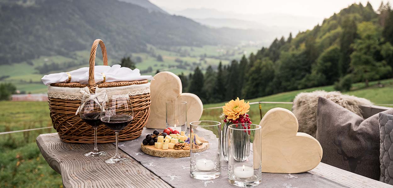 Für eine idyllische Auszeit inmitten von Almwiesen sorgen die beiden Packages "Sundowner unterm Kirschbaum" und "Schöner Augenblick" mit einem liebevoll arrangierten Picknickkorb unter dem Kirschbaum oder in den hauseigenen Alpenkörben. Bei einer Allgäuer Käseplatte sowie einer Flasche Rotwein können Urlauber am späten Nachmittag das Panorama der umliegenden Bergwelt genießen.