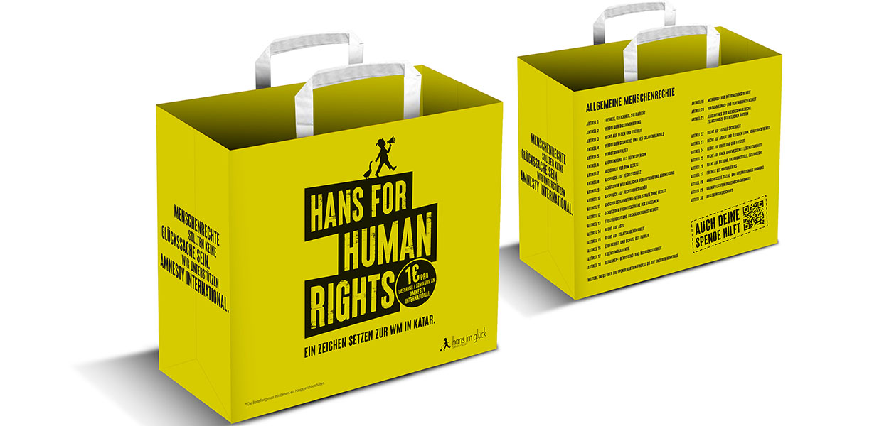 Um die Wichtigkeit des Themas sichtbar zu gestalten, erscheinen im Aktionszeitraum während der gesamten Weltmeisterschaft die Liefertüten und Burgerboxen in neuem Design. Darauf zu sehen sind die 30 Menschenrechte der UN-Charta. Die Botschaft ist klar: Für HANS IM GLÜCK sind Menschenrechte unverzichtbar.