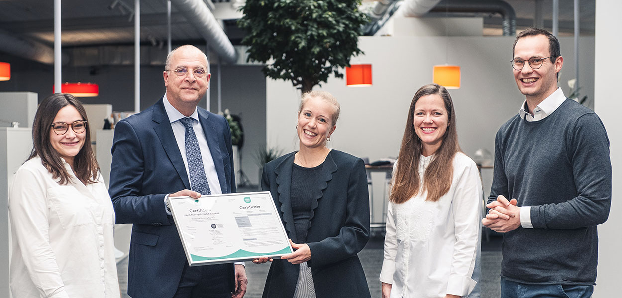 Offizielle Übergabe des OEKO-TEX®-RESPONSIBLE-BUSINESS-Zertifikats bei Weitblick in Kleinostheim. V. l. n. r.: Zoé Drost, Georg Dieners, Isabelle Ilori-King, Mareike Grytz und Michael Möller. Foto: Weitblick