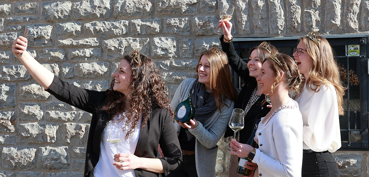 Die Deutsche Weinkönigin Katrin Lang, die Deutschen Weinprinzessinnen Luise Böhme und Juliane Schäfer machen mit der Sommerach Weinprinzessin Anna-Lena Zehnter und der 65. Fränkischen Weinkönigin Eva Brockmann (v. l. n. r.) einen Selfie während ihres Besuchs im Weinanbaugebiet Franken, der Silvaner Heimat seit 1659. Foto: Rudi Merkl/Gebietsweinwerbung Frankenwein-Frankenland GmbH