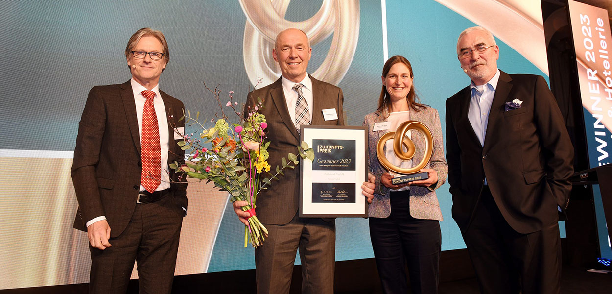 Daniela Schmid und Norbert Keßler (2. u. 3. v. r.) haben für Tollwood den INTERNORGA Zukunftspreis entgegengenommen. Rainer Roehl, Jurymitglied, (l.) und Bernd Aufderheide, Vorsitzender der Geschäftsführung der Hamburg Messe (r.), gratulierten bei der Preisübergabe. Foto: Hamburg Messe und Congress / Nicolas Maack