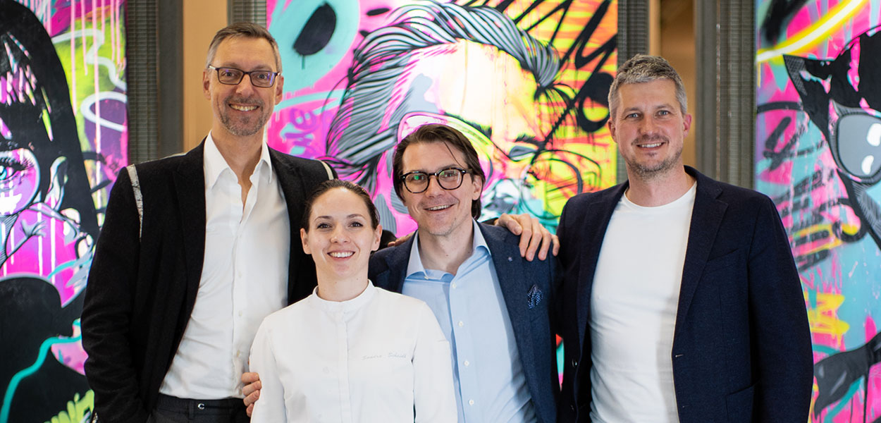 V.l.n.r.: Markus Ferrigato (Geschäftsführer WMF Österreich GmbH), Sandra Scheidl, Christoph Waltl (Tyolit Group), Matthias Pristach (Culinary meets Art). Foto: StokeSixAgency / MatthiasKuchling