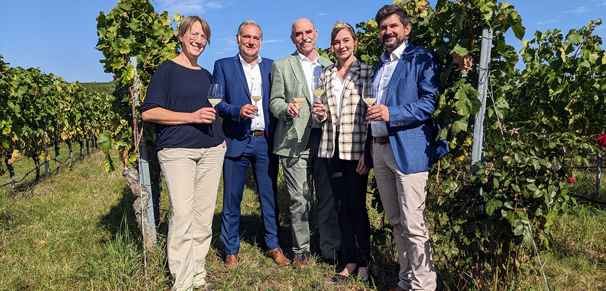 V. l. n. r.: Beate Leopold (Weinbauring Franken), Dr. Matthias Mend (LWG), Artur Steinmann (Präsident Fränkischer Weinbauverband), Anna-Lena Zehnter (Weinprinzessin Sommerach) und Ralf Schwarz (Bezirk Unterfranken) waren zur Erntebilanz in Sommerach. Fotos: Michael Bock/Fränkischer Weinbauverband
