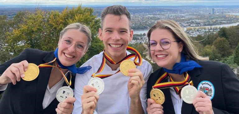 Restaurantfachfrau Lisa-Marie Harrer von der Heidexx Genusshütte in Heideck, Koch Tobias Pecher von Feinkost Käfer in München und Hotelfachfrau Pia Hopfensberger vom Hotel Kongressissimo in Vilsbiburg heißen die Siegerinnen und Sieger der Deutschen Jugendmeisterschaften 2023 in den gastgewerblichen Ausbildungsberufen. In der Einzelwertung holten alle drei bayerischen Kandidaten in ihrer Disziplin jeweils die Silbermedaille. Nach zwei spannenden Wettkampftagen bildete die feierliche Siegerehrung im Steigenberger Grand Hotel Petersberg vor 350 geladenen Gästen den Höhepunkt der Deutschen Meisterschaften.
