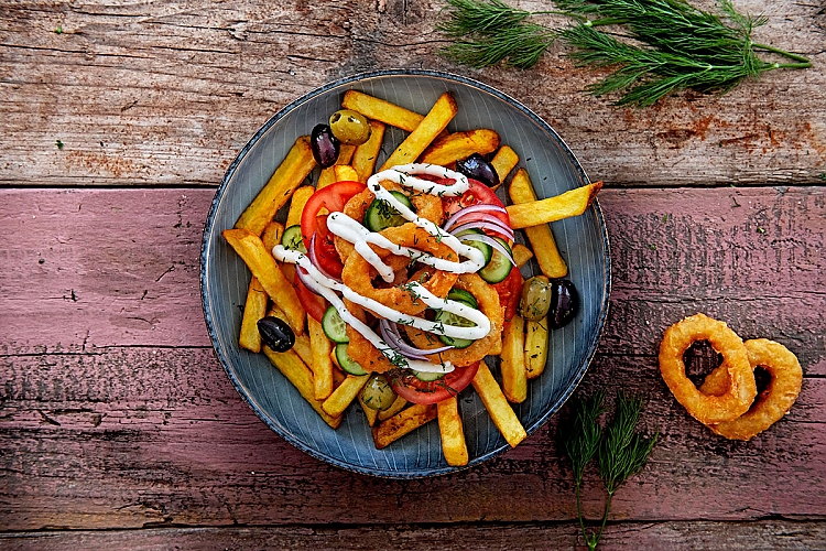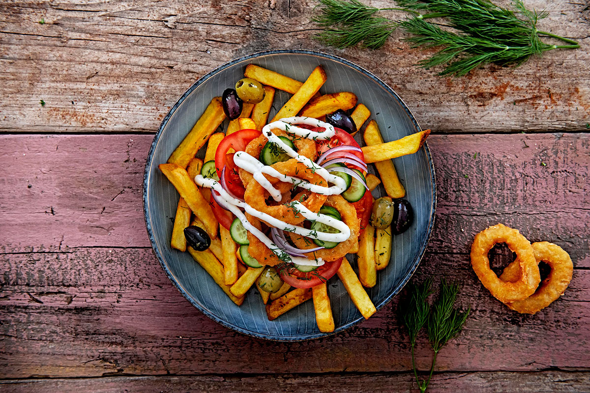 Tomaten und Gurken in Scheiben schneiden. Die Zwiebeln in halbe Ringe schneiden. Den Dill fein hacken. Die Calamari 3 bis 4 Minuten bei 170 °C frittieren, bis sie goldbraun sind, gut abtropfen lassen und warmhalten. Aviko SuperCrunch Pommes nach Packungsangabe frittieren, gut abtropfen lassen und mit Salz abschmecken. Die Pommes auf 10 Teller verteilen. Tomaten, Gurken und Zwiebeln über die Pommes geben. Die Calamari-Ringe darauflegen und mit Oliven, Knoblauchsauce und Dill abrunden.