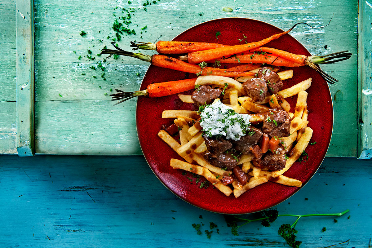 Die Butter schmelzen, das Fleisch anbraten und dann an die Seite schieben. Die Zwiebeln mit dem Lauch und den Karotten 5 Minuten lang sanft anbraten, ohne dass sie Farbe bekommen. Das Fleisch mit dem Gemüse vermischen. Bier und Brühe hinzufügen, Lorbeerblätter dazugeben und aufkochen. Die Hitze reduzieren und 3 Stunden köcheln lassen. Karotten schälen und die Blätter entfernen. Auf Backblechen verteilen, mit Olivenöl beträufeln und vermengen. Nach Geschmack mit Meersalz bestreuen. Die Karotten im vorgeheizten Backofen bei 220 °C 25 bis 30 Minuten al dente rösten. Petersilie fein hacken und mit der sauren Sahne vermischen. Aviko SuperCrunch Pommes nach Packungsangabe frittieren, gut abtropfen lassen und mit Salz abschmecken. Das Stew auf die gewünschte Konsistenz eindicken und mit Salz und Pfeffer würzen. Die Pommes und die Karotten auf Teller verteilen. Das Stew über die Pommes geben. Die Petersiliencreme separat servieren.