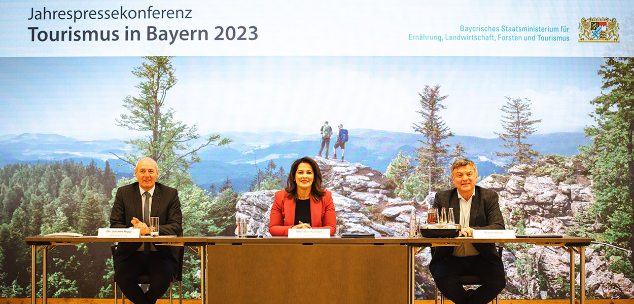 "2023 war ein Erfolgsjahr für den Bayern-Tourismus. Wir haben das Niveau von 2022 übertroffen und liegen nur ganz knapp unter den Werten des Rekordjahres 2019", so das Fazit von Landwirtschaftsministerin Michaela Kaniber auf der Jahrespressekonferenz Tourismus (auf dem Foto eingerahmt von links Dr. Johann Niggl, Abteilungsleiter Tourismus, und Pressesprecher Franz Stangl, rechts). "Zum zweiten Mal überhaupt haben wir im vergangenen Jahr die magische Grenze von 100 Millionen Gästeübernachtungen überschritten. Dieses großartige Ergebnis der Branche verdient besondere Anerkennung, insbesondere angesichts der wirtschaftlichen Rahmenbedingungen, die den Betrieben viel abverlangt hat. Dass die Bilanz dennoch so positiv ausfällt, unterstreicht die enorme Widerstandskraft der Branche und den Elan der Menschen, die dort arbeiten."