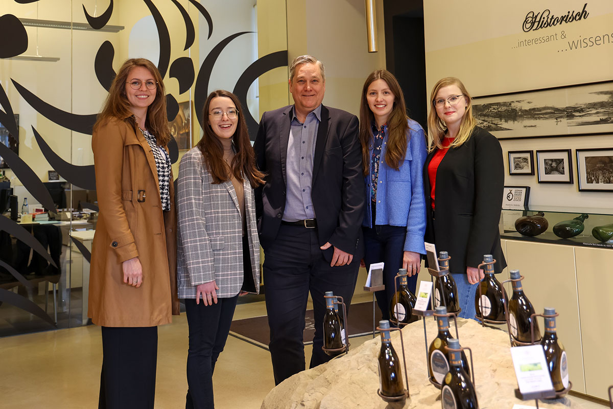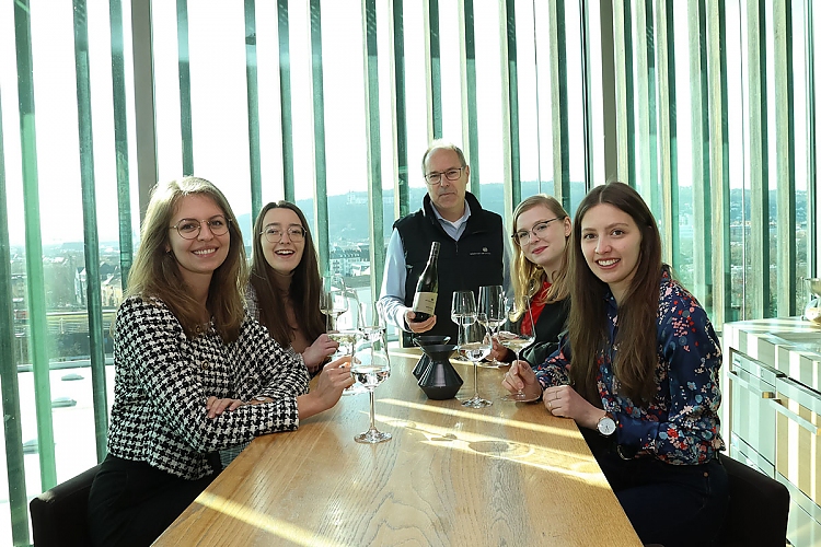 Zu Besuch im Staatlichen Hofkeller Würzburg: Eva Brockmann, Lisa Lehritter, Weingutsdirektor Thilo Heuft, Anne Gümpelein und Laetitia Stockmeyer (v. l. n. r.).
