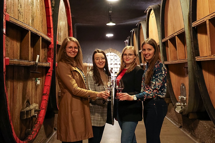 Beim anschließenden Besuch des Staatlichen Hofkellers Würzburg erlebten Anne Gümpelein, Lisa Lehritter und Laetitia Stockmeyer eine gelungene Symbiose von Moderne und Historie. Weingutsdirektor Thilo Heuft stellte das 1128 erstmals erwähnte und damit älteste urkundlich belegte Weingut in Deutschland vor.