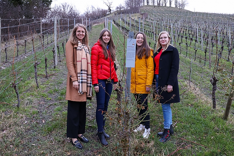 Am Ort der ersten Silvaner-Pflanzung im Jahr 1659 in Franken: Eva Brockmann, Anne Gümpelein, Lisa Lehritter und Laetitia Stockmeyer (v. l. n. r.) im Casteller Kirchberg.