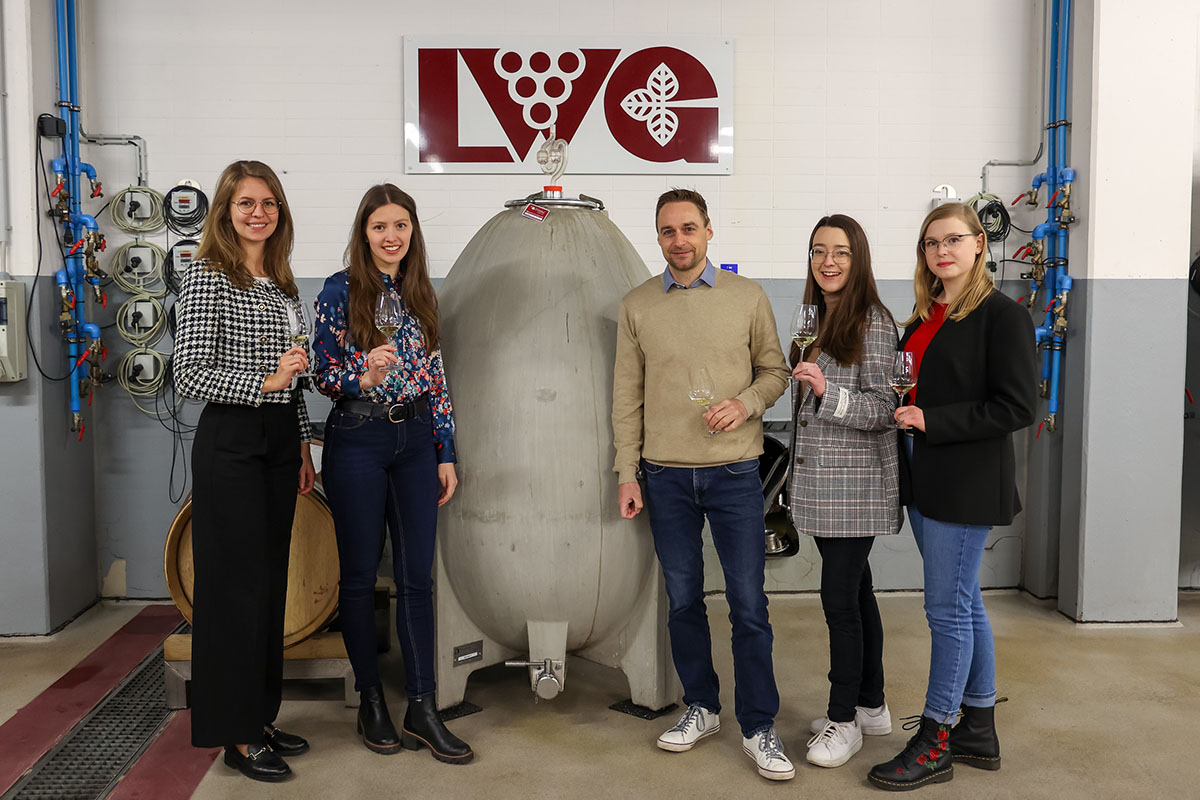 Beim Rundgang durch die Bayerische Landesanstalt für Weinbau und Gartenbau (LWG) in Veitshöchheim: Eva Brockmann, Anne Gümpelein, Johannes Burkert, Lisa Lehritter und Laetitia Stockmeyer (v. l. n. r.) in den Versuchskellern der LWG.