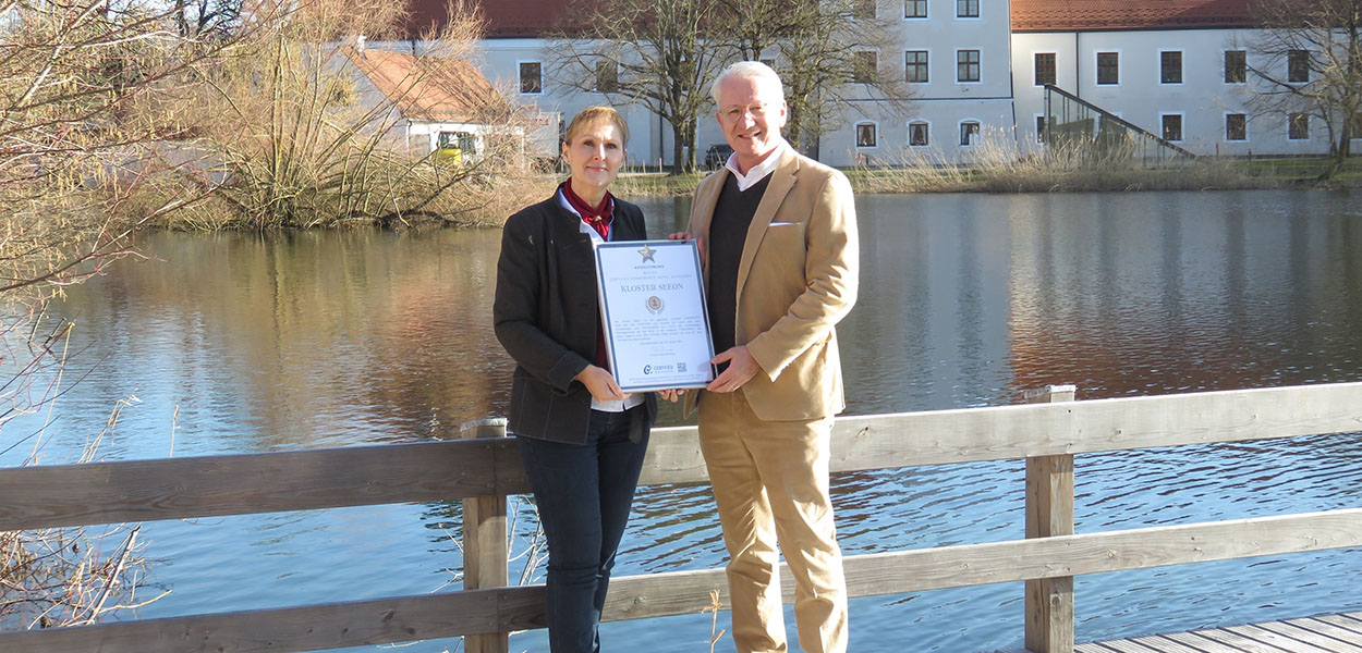 Schon bei der Erstklassifizierung im Jahr 2022 erhielt das Haus das Prädikat "Exzellent". "Daraufhin haben wir die Anregungen der Prüfer aufgenommen und direkt umgesetzt", so Inge Ederer-Posch und Gerald Schölzel (siehe Foto) von der Geschäftsleitung des Kloster Seeon. Fazit im neuen Prüfbericht: "Beeindruckend ist sicherlich die Umgebung, welche zur Abwechslung bei einer intensiven Tagung dazu einlädt, Spaziergänge um den See zu machen, die vielen kulturellen Angebote oder einfach mal den See in Stille zu genießen. Das Team vor Ort lebt eine Herzlichkeit und das rundet dieses wunderbare Haus als Kraftquelle ab."