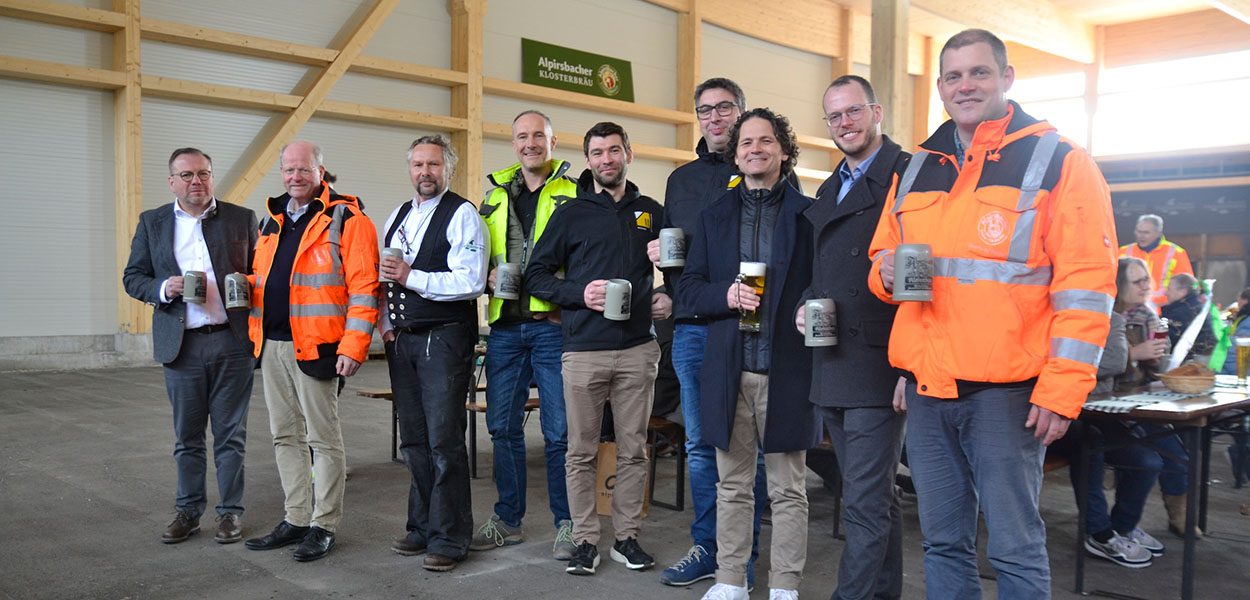 Beim Richtfest der neuen Abfüllhalle am 1. März (v. l. n. r.): Markus Schlör, Carl Glauner, Ralf Heinzelmann, Sebastian Kummer, David Maier, Jürgen Isemann, Florian Diesler, Moritz Glauner und Berthold Bader. Foto: Sonja Störzer / Schwarzwälder Bote