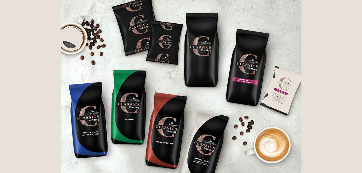 J.J. Darboven Classics – in diese Dachmarke integriert der Hamburger Heißgetränke-Spezialist künftig auch sein Automaten-Sortiment J.J. Darboven Classics Vending. Im Fokus stehen fünf geschmacksstarke Röstkaffee-Sorten, löslicher Kaffee und Füllprodukte wie Toppings oder Kaffeeweißer. Dabei bleibt das Unternehmen seinem Markenversprechen eines erstklassigen Kaffeegenusses treu, welches es seit über 150 Jahren lebt. Das neue zeitgemäße und einheitliche Design besticht durch die schwarze Folie in matter Optik sowie dem Logo in Kupfer-metallic mit dem Zusatz Vending. Damit wird die Verbindung zur J.J. Darboven Classics-Linie deutlich, zugleich der Unterschied aber weiterhin betont. Die Produkte sind ab sofort verfügbar.