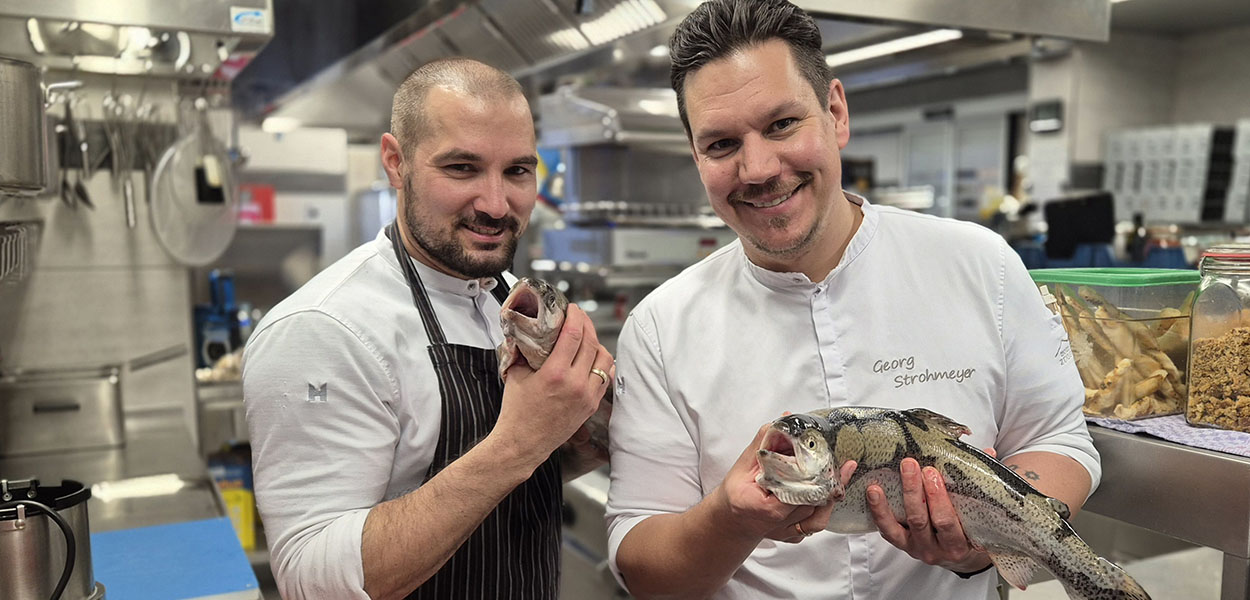 Das bedeutet auf der anderen Seite: Seefische wie Thunfisch, Steinbutt oder Rotbarsch finden sich künftig nicht mehr auf den Karten der drei Restaurants des Vier-Sterne-Superior-Hotels. "Unsere bodenständige und fantasievolle Frischeküche bedient sich bereits einer Vielzahl von hochwertigen und einzigartigen Zutaten unserer Region", sagt Georg Strohmeyer (Foto re.), Küchenchef im Hotel Zugspitze. "Es war nur eine Frage der Zeit, bis wir auch Seefische vollständig ersetzen. Bedrohte Bestände und hohe Emissionen durch lange Lieferwege stehen unserem bewussten Speisen-Konzept entgegen."
