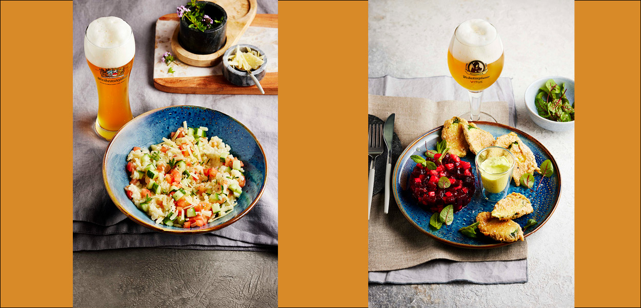 - Würziges Bierrisotto mit Gurken, Tomaten, Kräutern und Parmesan – Bierempfehlung: Weihenstephaner Hefeweißbier.