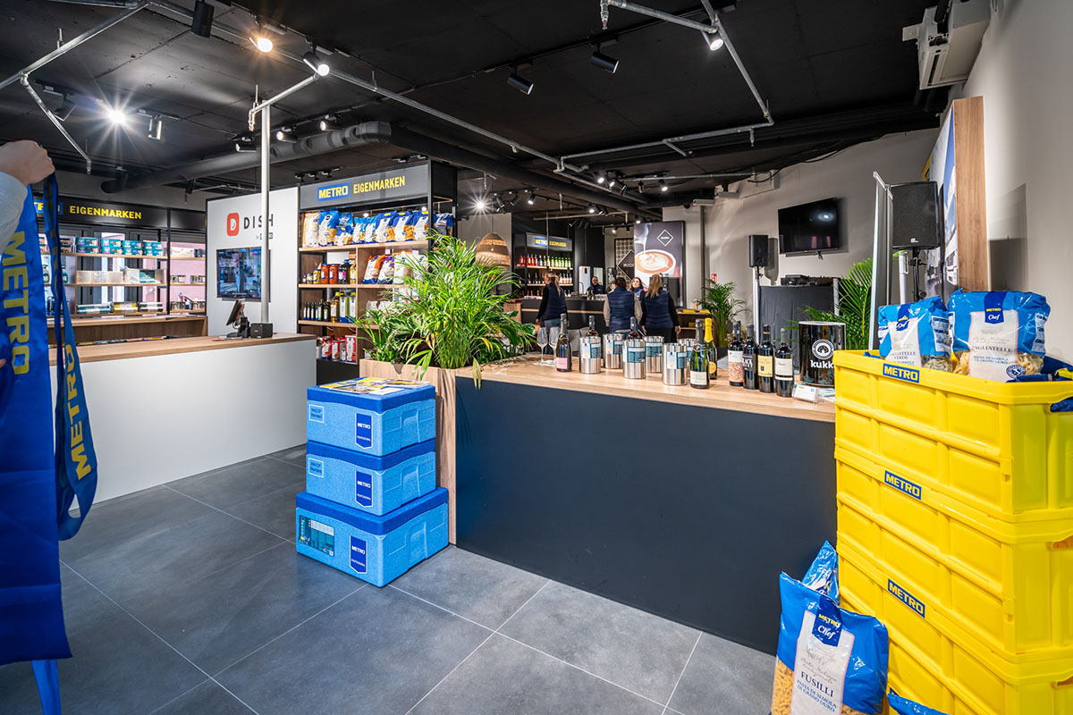 Zusätzlich wurde außerdem eine Bühne platziert, die Raum für Branchentreffen und offene Diskurse schafft. Zukünftig soll es hier Eventreihen zu unterschiedlichen gastronomierelevanten Themen wie beispielsweise Nachhaltigkeit oder Digitalisierung geben. Auch digitale Präsentationsflächen finden auf den rund 230 qm Platz statt und geben einen guten Überblick über die digitalen Lösungen von DISH (Digital Innovations and Solutions for Hospitality) und dem METRO Onlineshop – so wird der Multi-Kanal-Großhandelsgedanke abgerundet. Rund 1.600 Kundinnen und Kunden können zukünftig aus dem METRO Verkaufsbüro betreut werden können.