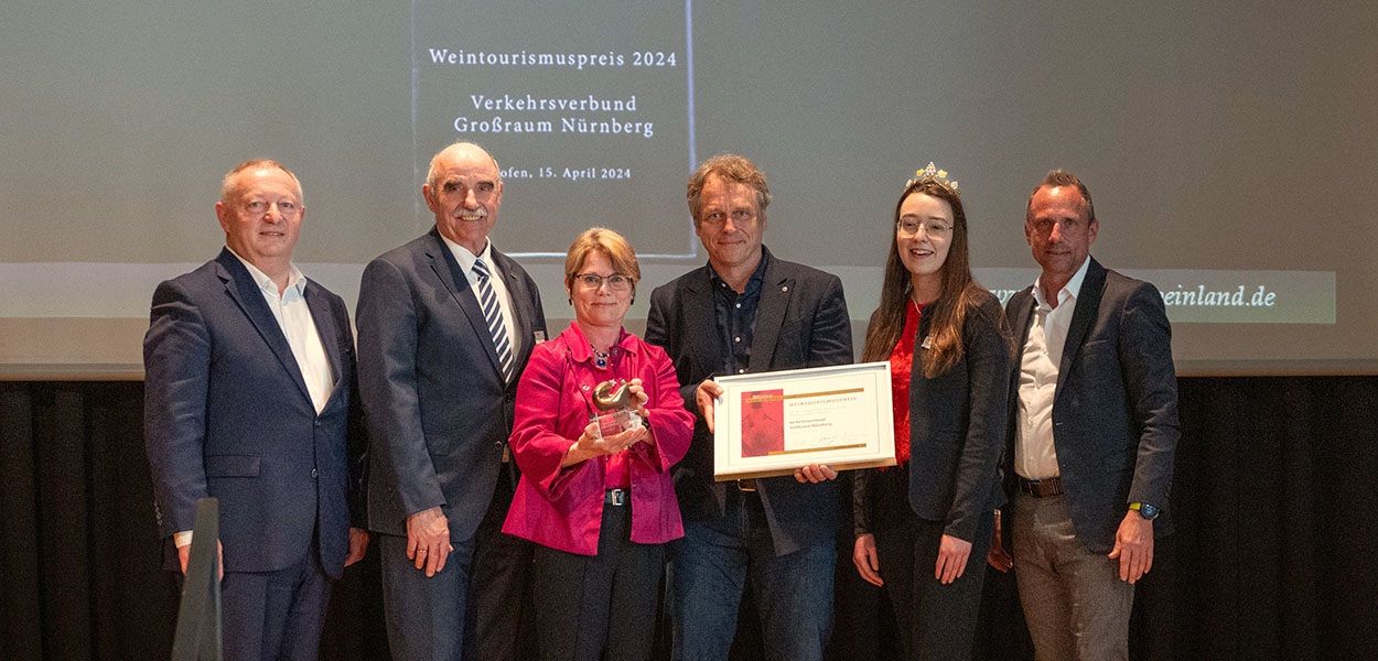 Der Fränkische Weintourismuspreis 2024 geht an den Verkehrsverbund Großraum Nürnberg (VGN). Im Rahmen eines Festaktes in der Karl-Knauf-Halle in Iphofen durfte Geschäftsführerin Anja Steidl stellvertretend für den VGN, der in vortrefflicher Weise mit zahlreichen Bus- und Zuglinien den Frankenwein mit dem Tourismus verbindet, die Auszeichnung entgegennehmen.
