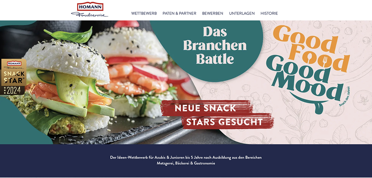 Teilnehmen können die Youngster als Einzelkämpfer oder im Zweier-Team, wobei sie maximal fünf Jahre nach Abschluss ihrer Ausbildung in ihrem Beruf tätig sein dürfen. Der Einsendeschluss ist der 24. Juni 2024. Alle, die interessiert sind, können sämtliche erforderlichen Informationen und Bewerbungsmaterialien kostenlos auf www.homann-snackstar.de herunterladen.