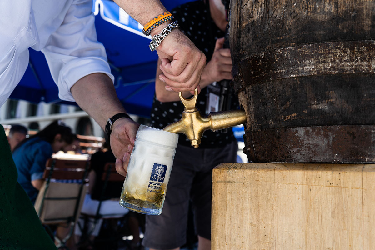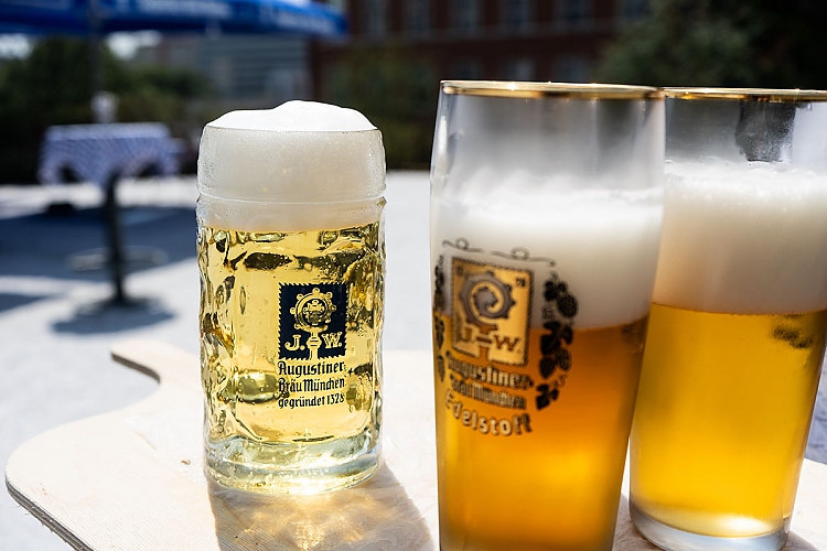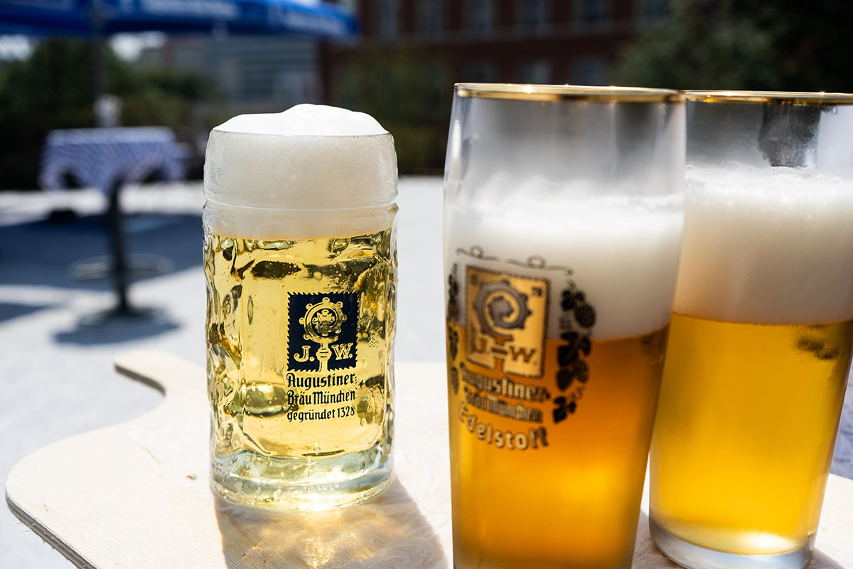Neben den kulinarischen Köstlichkeiten bietet der Biergarten eine umfangreiche Auswahl an Bierspezialitäten von Augustiner. Vom klassischen Hellen Lagerbier (4,60 € für 0,5 l) und Dunkelbier (4,90 € für 0,5 l) – frisch vom Fass gezapft – über das beliebte Edelstoff (4,90 € für 0,5 l) oder die Hefeweizen- und Spezialbiere aus der Flasche bis hin zu alkoholfreien bayerischen Biersorten ist für jeden Geschmack etwas dabei. Im großen Selbstbedienungs-Pavillon sowie an einer separaten Bierbar werden dafür extra gekühlte Biergläser bereitgestellt.