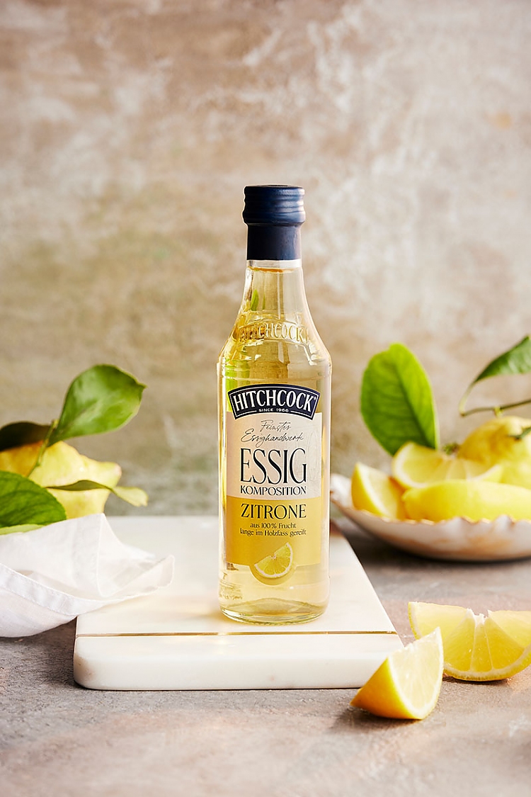 Die HITCHCOCK Fruchtessig-Komposition Zitrone eignet sich perfekt für belebende Drinks und verleiht ihnen eine fruchtige Note. In sommerlichen Salaten sorgt sie für eine harmonische Balance zwischen süß und sauer und verfeinert jedes Gemüsegericht mit einer zitronigen Frische. Auch in herzhaften Speisen entfaltet der Zitronenessig seine ganze Vielseitigkeit, indem er Gemüse-, Fleisch- und insbesondere auch Fischgerichten eine feine leichte Säure gibt. Doch damit nicht genug – auch für Desserts ist die Fruchtessig-Komposition Zitrone eine wahre Bereicherung. Ob als Geheimzutat in süßen Kreationen oder als Zugabe in Sorbets und Eis – die Möglichkeiten sind grenzenlos.
