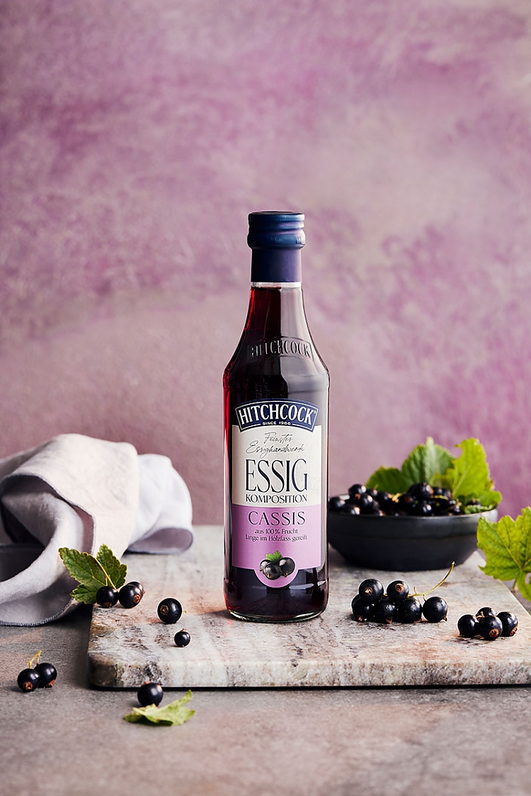 Die HITCHCOCK Fruchtessig-Komposition Cassis verleiht nicht nur exklusiven Cocktails und Mocktails eine süß-säuerliche Beeren-Note, sondern auch Salaten mit buntem Gemüse. Durch die Zugabe des Fruchtessigs wird der Geschmack wunderbar fein und aromatisch ausbalanciert. Zudem harmoniert die fruchtige Intensität perfekt mit frischen Blattsalaten, zarten Spinatblättern und herzhaftem Ziegenkäse sowie knackigen Walnüssen – aber auch mit zartem Rinderfilet, gebratenem Hähnchen oder Wild. Außerdem ist der Fruchtessig für süße Versuchungen unverzichtbar. Denn die verführerische Beeren-Essenz bringt Desserts, Torten und Eiscremekreationen auf ein neues Level und intensiviert die fruchtigen Aromen der Nachspeise.