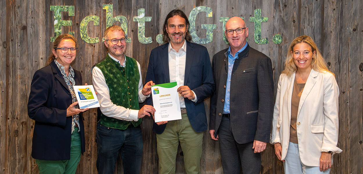 Auch verzichten die Mitglieder der Genossenschaft seit 2017 auf den Einsatz von Totalherbiziden wie Glyphosat auf den Wiesen und Ackerflächen. Über die Abwärme der betriebseigenen Energiezentrale wird die Milch erhitzt und zusätzlich alle Gebäude am Unternehmensstandort beheizt. Mit den Worten "Ich möchte mich für Ihren Einsatz für unser Klima und die Umwelt im Berchtesgadener Land aufs herzlichste bedanken und wünsche Ihnen weiterhin viel Erfolg in Ihren Bestrebungen für den Erhalt unserer einzigartigen Landschaft", überreichte Landrat Bernhard Kern die Urkunde im Namen von Umweltminister Thorsten Glauber.