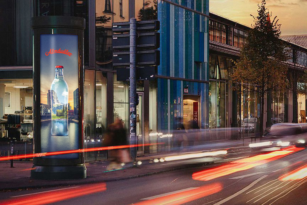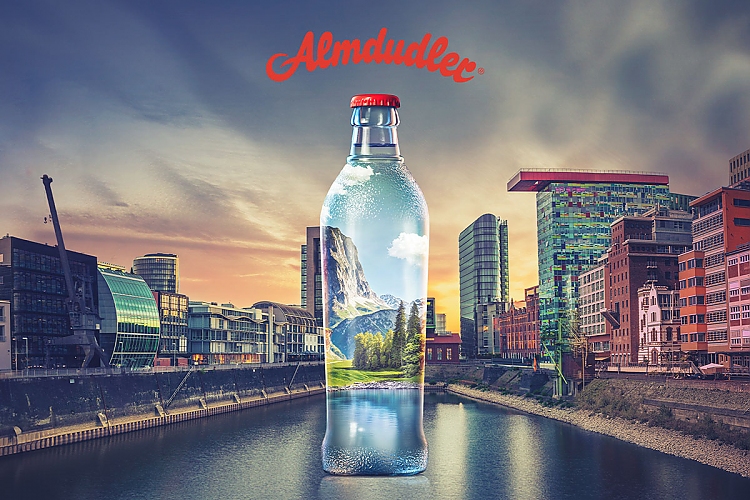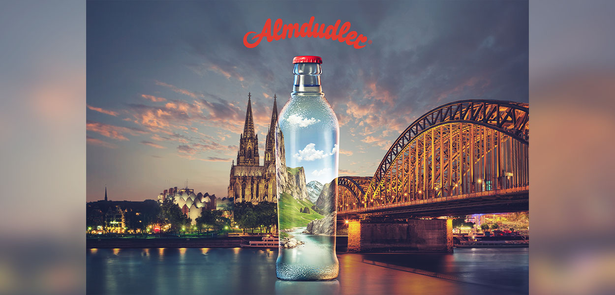 Wer aktuell in Köln oder Düsseldorf unterwegs ist, entdeckt mit ziemlicher Sicherheit ein Riesenposter, Großflächenplakat oder Citylight mit der Almdudler Trachtenpärchenflasche vor Dom und Rheinbrücke bzw. inmitten der Rheinbauten. Die Flasche ist diesmal nicht mit erfrischender Alpenkräuterlimonade gefüllt, vielmehr geht das Citysujet in eine imposante Alpenlandschaft über.