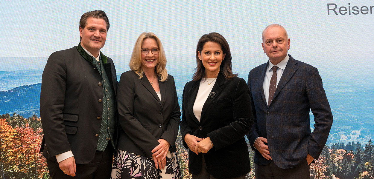 V. l. n. r.: Dr. Thomas Geppert (Geschäftsführer DEHOGA Bayern), Barbara Radomski (Geschäftsführerin BayTM), Staatsministerin Michaela Kaniber und Karlheinz Jungbeck (Vorstand für Tourismus des ADAC Südbayern). Foto: Maria Maier/StMELF