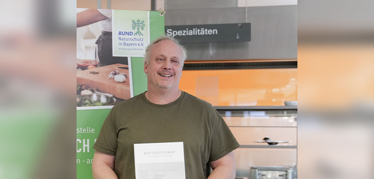 Bio-Essen in der Außer-Haus-Verpflegung (AHV) anzubieten – das ist eine Herausforderung, die nur durch umfassendes Know-how und mit einem guten Netzwerk zu meistern ist. Um den Verantwortlichen der AHV den Einstieg und die Umstellung zu nachhaltigen, bio-regionalen Lebensmitteln zu erleichtern, bietet die Projektstelle Ökologisch Essen des BUND Naturschutz München seit mehr als 20 Jahren Unterstützung für Küchenchefs und Gastronomen an. Jürgen Wiesenhofer, Betreiber u. a. der städtischen Rathauskantine, der Kantine des Technischen Rathauses sowie der Polizeikantine hat den Zertifikatslehrgang "Nachhaltige Gastronomie" besucht und seinen Weg der Bio-Versorgung in seinen Kantinen weiter konsequent beschritten: Auf Basis der neuen Bio-Außer-Haus-Verordnung ist sein Unternehmen nun mit Bronze zertifiziert worden, das heißt: Er hat den Anteil der Bio-Lebensmittel sukzessive auf derzeit 36 % erhöht!