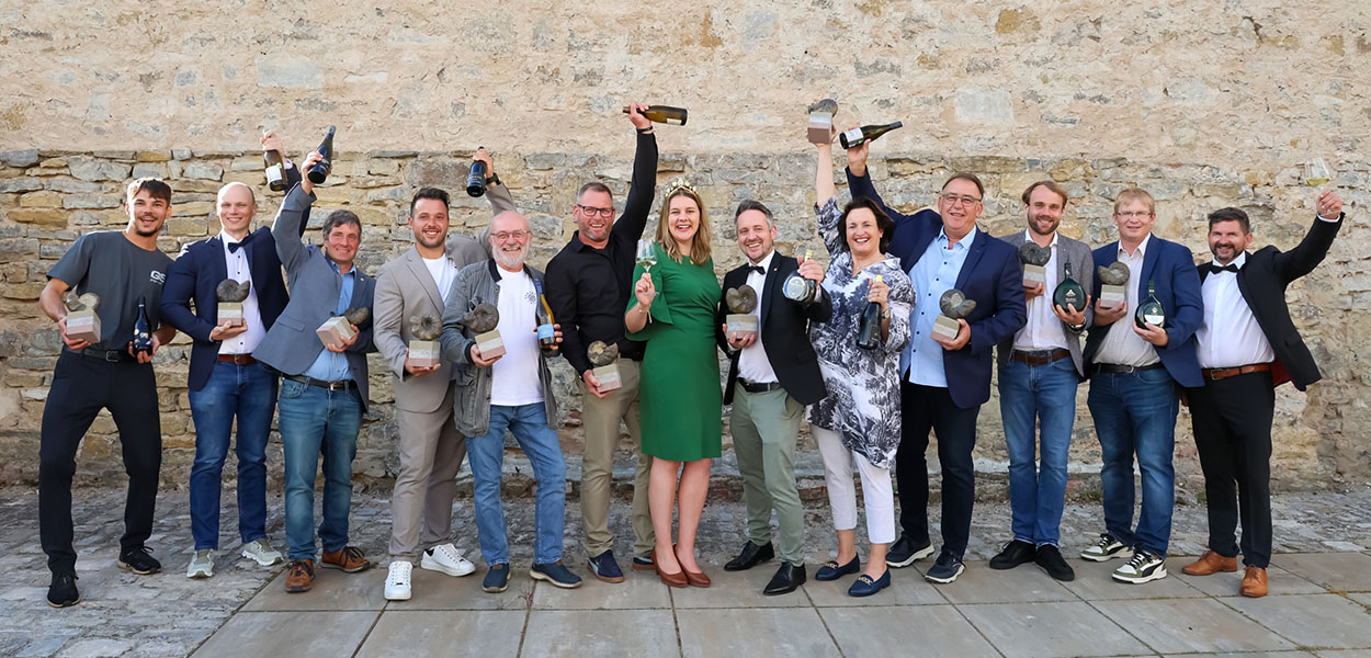 Die Vertreter der siegreichen Weingüter und Winzergenossenschaften von "Best of Franken" 2025: Weingut Geiger & Söhne, Weingut Pastoriushaus, Weingut Rainer Sauer, Weingut Kremer, Weingut Rothe, Weingut Waldemar Braun, Fränkische Weinkönigin Antonia Kraiß, Weingut Bürgerspital Würzburg, Weingut Hans Wirsching, Weingut Roland Staudt, Weingut am Ölspiel, Weingut Popp und Ralf Schwarz vom Bezirk Unterfranken (v.l.n.r.). Fotos: Rudi Merkl/Gebietsweinwerbung Frankenwein-Frankenland GmbH