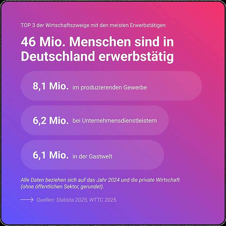 Die aufgeführten Daten beziehen sich in der Regel auf das Jahr 2024 und basieren auf aktuellen Veröffentlichungen des World Travel & Tourism Council (WTTC) und Statistischen Bundesamtes (Destatis). Außerdem flossen Zahlen aus der im Jahr 2022 veröffentlichten Grundlagenstudie des Fraunhofer IAO "Wirtschaftsfaktor 360° Gastwelt" ein.