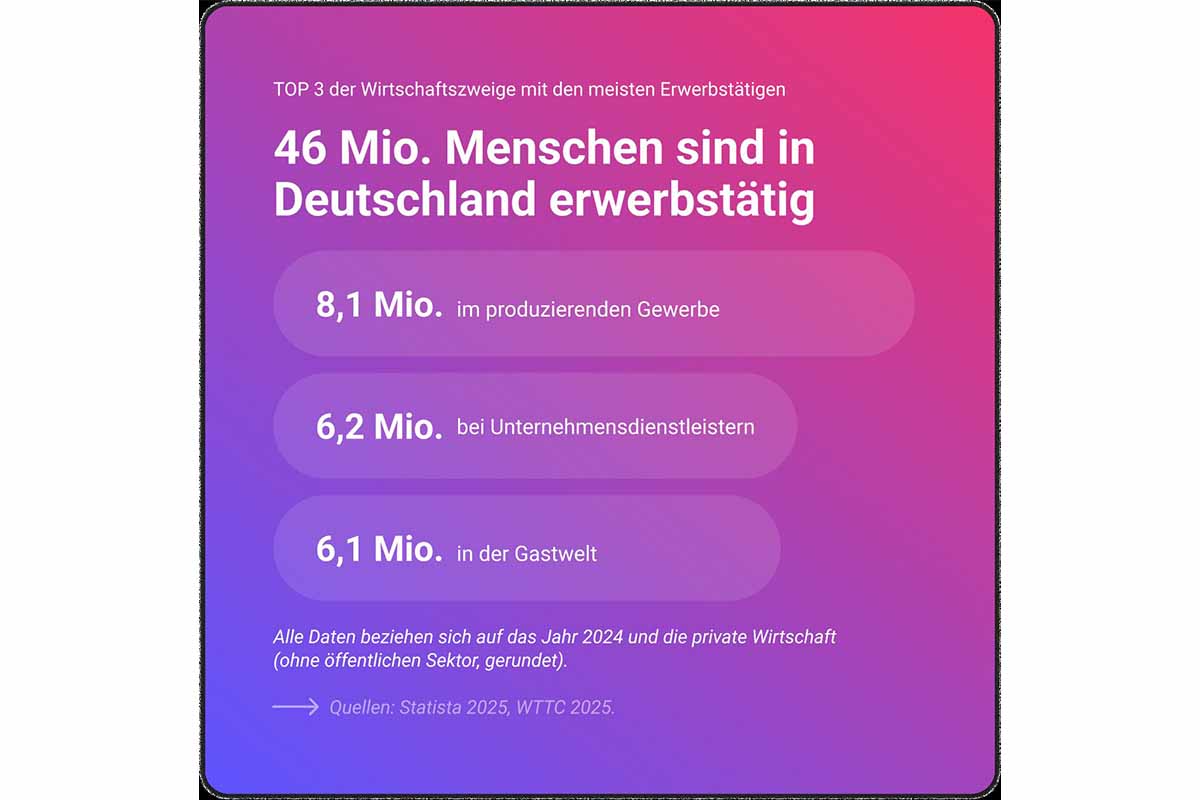 Mit rund 6,1 Millionen Erwerbstätigen zählt der Dienstleistungssektor Gastwelt – bestehend aus den Teilbranchen Tourismus, Hospitality, Foodservice und Freizeitwirtschaft – als einer der drei größten Arbeitgeber Deutschlands. Das zeigen aktuelle Leistungskennzahlen der Denkfabrik Zukunft der Gastwelt (DZG), die ihre Gastwelt-KPIs für 2024 veröffentlichte. Besonders eine Zahl sticht dabei heraus: Der Beitrag des Sektors zur Bruttowertschöpfung ist im vergangenen Jahr um über 30 Milliarden auf 483,7 Milliarden Euro gestiegen, was 11,2 % des gesamten Bruttoinlandsprodukts (BIP) entspricht. Während das BIP im Jahr 2024 nominal um 2,5 % stieg, wuchs der Gastwelt-Anteil überdurchschnittlich um ganze 6,3 %.