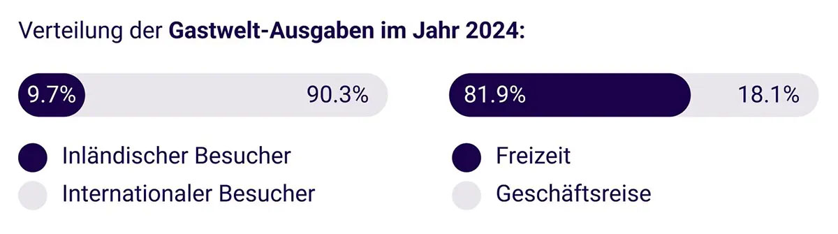 Damit rückt die Gastwelt auch ökonomisch stärker ins Zentrum: In der Privatwirtschaft beschäftigen nur das produzierende Gewerbe (8,1 Millionen Beschäftigte) und die Unternehmensdienstleistungen (6,2 Millionen) mehr Menschen als die Gastwelt (6,1 Millionen, direkt/indirekt). Gleichzeitig tätigte der Sektor im Jahr 2024 Investitionen in Höhe von 36,3 Milliarden Euro, was den zweithöchsten Wert der letzten Dekade darstellt. Auch die touristischen Kennzahlen sind positiv: Mit 496,1 Millionen Übernachtungen (+1,9 % im Vorjahresvergleich) wurden 2024 mehr Gäste als im bisherigen Rekordjahr 2019 (+0,1 %) empfangen und damit ein neues Allzeithoch aufgestellt.