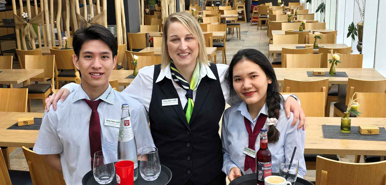 Doppelter Nachwuchs für Gastronomie und Hotellerie: Zwei junge Menschen aus Vietnam haben im Rhön Park Aktiv Resort ihre Ausbildung erfolgreich abgeschlossen und freuen sich über die Übernahme.