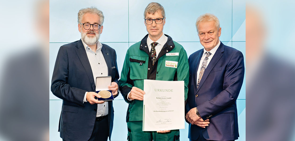 Der Bundesehrenpreis für Fruchtgetränke ging in diesem Jahr erneut an das Familienunternehmen Beckers Bester. Die Auszeichnung gilt als die höchste Ehrung der deutschen Ernährungswirtschaft. Lothar Welker, Geschäftsführer des niedersächsischen Fruchtsaftherstellers, nahm Urkunde und Medaille von Alois Rainer, Bundesminister u.a. für Ernährung, und Dr. Diedrich Harms, Vizepräsident der DLG (Deutsche Landwirtschafts-Gesellschaft) im Berliner Ministerium entgegen.