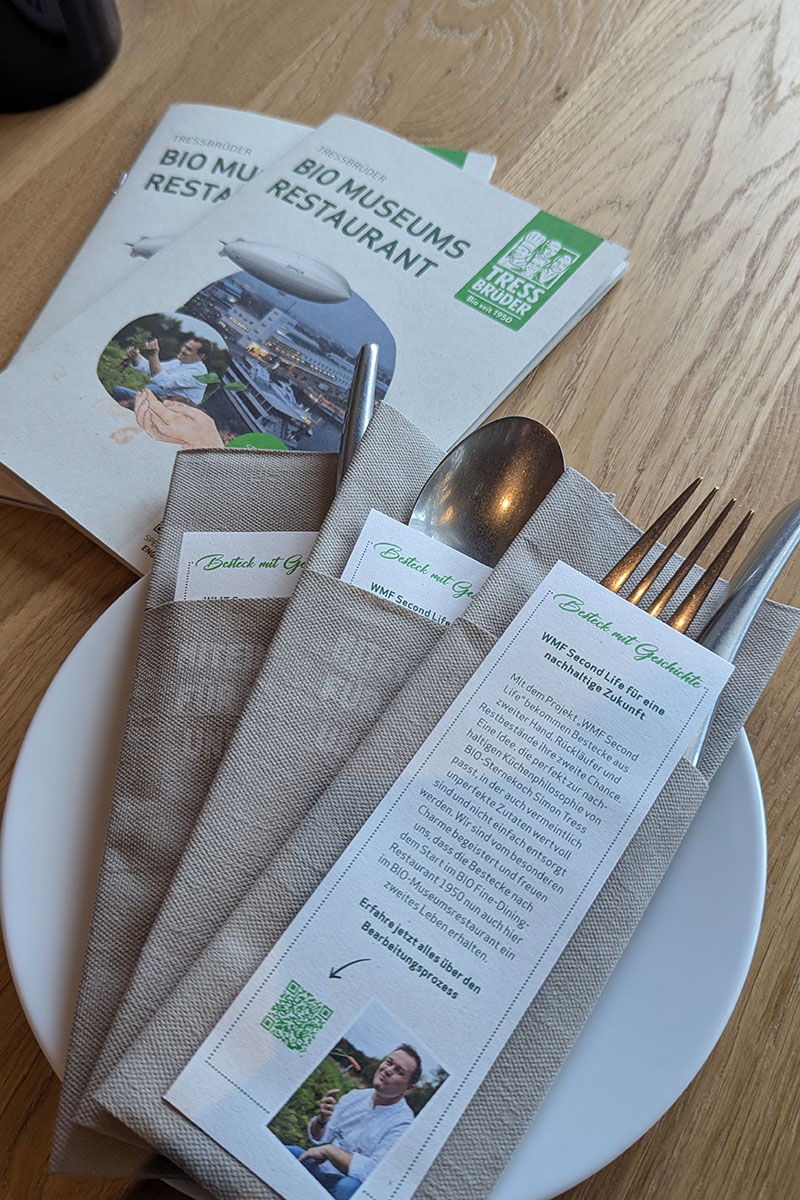 Auch im Restaurant des Zeppelin Museums weichen Tischdecken bewusst puristischen Elementen. Stattdessen setzt Tress auf hochwertige Akzente wie Besteck, Geschirr und echtes Holz. "Nachhaltigkeit und Genuss schließen sich nicht aus. Im Gegenteil – das Besteck macht das Erlebnis unserer Gäste erst rund", so Tress. Material und Haptik spielen dabei für den Sternekoch eine zentrale Rolle. Gerade weil er den Fokus am Tisch auf den Genuss legt, ist ihm ein hochwertiges Handgefühl überaus wichtig. WMF Second Life fasst er entsprechend in drei Worten zusammen: "Perfekt, weil unperfekt."