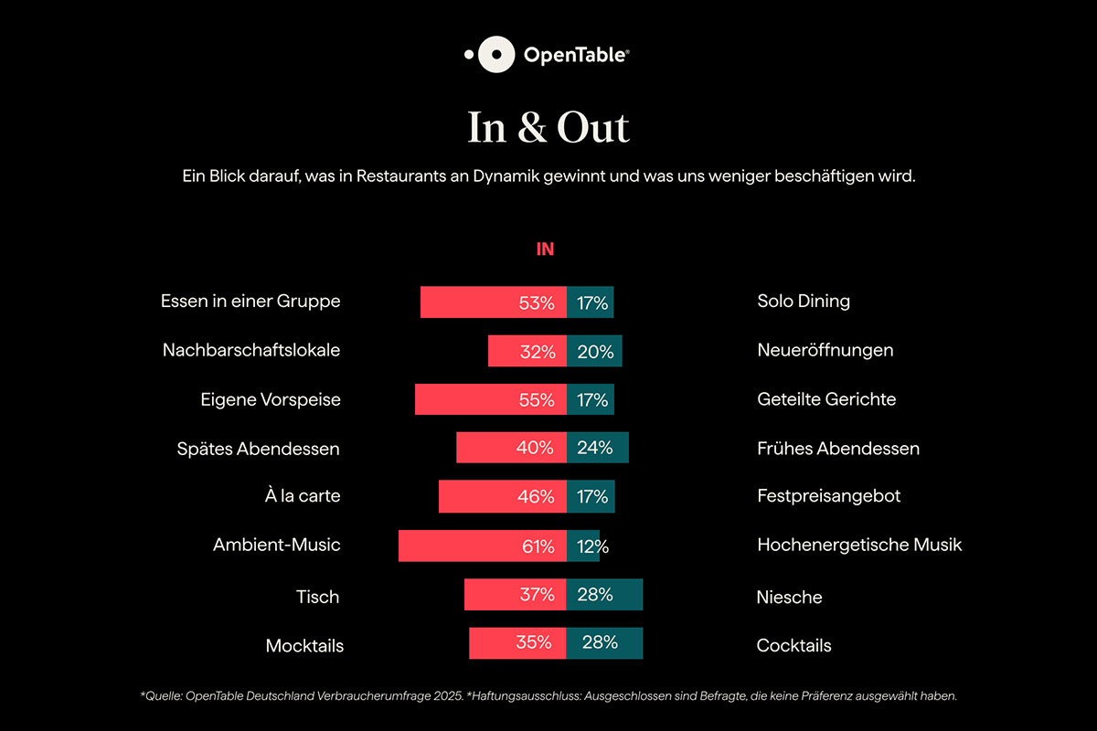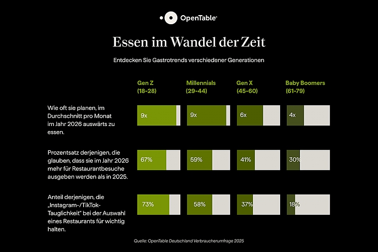 "Deutsche Restaurantgäste sehnen sich nach Verbundenheit, sei es beim gemeinsamen Essen mit Freunden, der Familie oder beim Date", sagt Lea Stadler, Senior Director of Restaurant Sales & Services bei OpenTable. "Über ein Drittel (39 %) der Restaurantgäste äußert den Wunsch nach mehr Möglichkeiten für Essen in Gruppen und Abendessen in privaten Settings im Jahr 2026. Dies ist eine großartige Chance für Restaurants, durch Menüs oder Sitzpläne gemeinsame Essenserlebnisse zu schaffen – insbesondere während der bevorstehenden Feiertage."