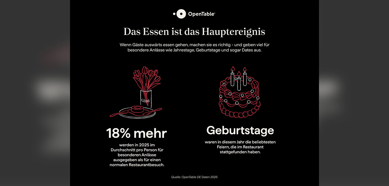 ***OpenTable Data: OpenTable hat die Anzahl der platzierten Gäste, die bei der Reservierung einen besonderen Anlass (Geburtstag, Jubiläum, Date, Geschäftsessen) angegeben haben, untersucht und die durchschnittlichen Ausgaben für besondere Anlässe mit den durchschnittlichen Ausgaben für "normale" Restaurantbesuche verglichen, basierend auf Online-Reservierungen für alle aktiven Restaurants auf der OpenTable-Plattform in Deutschland vom 1. Januar bis 31. August 2025, und diese mit dem entsprechenden Zeitraum im Jahr 2024 verglichen (3. Januar bis 1. September 2024).