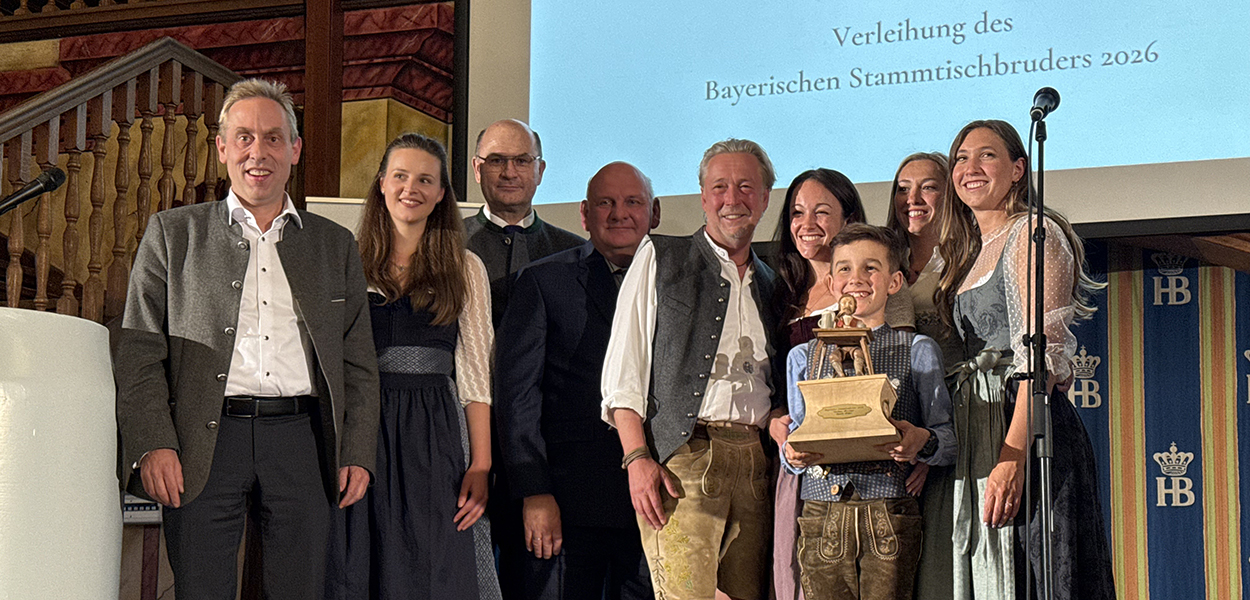 Der Verein zum Erhalt der bayerischen Wirtshauskultur (VEBWK) hat am Montagabend im großen Festsaal des Münchner Hofbräuhauses den „Bayerischen Stammtischbruder 2026" verliehen. Die bereits zum 13. Mal vergebene Auszeichnung geht in diesem Jahr an Lorenz Hilger, Wirt des Gasthofs Hirzinger in Riedering im Landkreis Rosenheim. Die Laudatio auf den Preisträger hielt der Bayerische Staatsminister für Finanzen und Heimat, Albert Füracker.