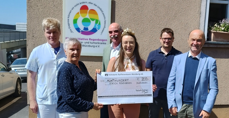 Fränkische Weinkönigin übergibt Spendenscheck an Elterninitiative Regenbogen für leukämie- und tumorkranke Kinder.